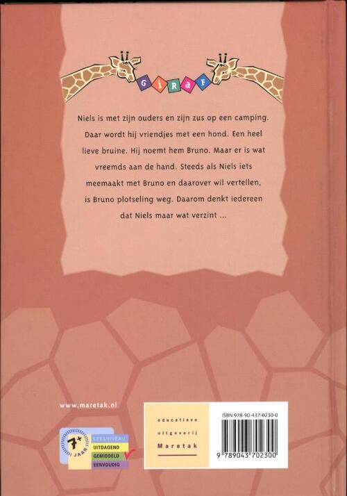 Niels is met zijn ouders en zijn zus op een camping. Daar wordt hij vriendjes met een hond. Een heel lieve bruine. Hij noemt hem Bruno. Maar er is wat vreemds aan de hand. Steeds als Niels iets meemaakt met Bruno en daarover wil vertellen, is Bruno plotseling weg. Daarom denkt iedereen dat Niels maar wat verzint ... Trefwoorden: vakantie, dieren Leeftijd: 7+ AVI: E4