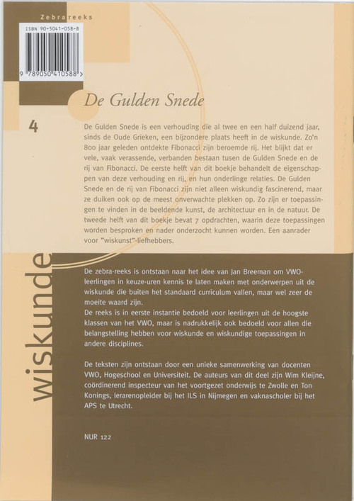De Gulden Snede is een verhouding die al twee en een half duizend jaar, sinds de Oude Grieken, een bijzondere plaats heeft in de wiskunde. Zo'n 800 jaar geleden ontdekte Fibonacci zijn beroemde rij. Het blijkt dat er vele, vaak verrassende, verbanden bestaan tussen de Gulden Snede en de rij van Fibonacci. De eerste helft van dit boekje behandelt de eigenschappen van deze verhouding en rij, en hun onderlinge relaties. De Gulden Snede en de rij van Fibonacci zijn niet alleen wiskundig fascinerend, maar ze duiken ook op de meest onverwachte plekken op. Zo zijn er toepassingen te vinden in de beeldende kunst, de architectuur en in de natuur. De tweede helft van dit boekje bevat 7 opdrachten, waarin deze toepassingen worden besproken en nader onderzocht kunnen worden. Een aanrader voor 'wiskunst'-liefhebbers.