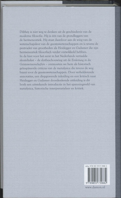 In de hier voor het eerst in het Nederlands vertaalde sleuteltekst - de slotbeschouwing uit de Einleitung in die Geisteswissenschaften - ontmoeten we hem als historisch geïnspireerde criticus van de metafysica die tevens de weg baant voor de geesteswetenschappen. Door verhelderende annotaties, een diepgravende inleiding en een kritisch naar Heidegger en Gadamer doordenkende uitleiding is dit boek een uitstekende introductie in het spanningsveld van metafysica, historische interpretatieleer en kritiek.