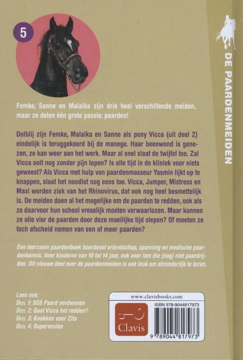 In het vijfde deel van De Paardenmeiden is pony Vicca na een herstelperiode in de kliniek terug op de manege. Femke en Malaika doen al het mogelijke om haar weer soepel te laten lopen. Maar het lijkt wel of haar blessure niet goed genezen is. Gelukkig vinden ze een paardenmasseur die hen kan helpen. Maar waar halen ze het geld vandaan om een cursus masseren van paarden te volgen? Al hun vrije tijd gaat op aan het verzorgen van Vicca. Tot hun ouders ontdekken dat de meiden erg slechte cijfers halen op school. Net als het hun verboden wordt om nog naar de manege te gaan, slaat het noodlot toe: een vreselijk virus maakt enkele paarden ziek. Ook Vicca en Jumper worden doodziek en moeten 24 uur per dag verzorgd worden. Nu is hun hulp meer dan ooit nodig! Kiezen de meiden voor school of voor de paarden? En zijn de paarden wel te redden? Of is Jumper al te zwak om te overleven?
