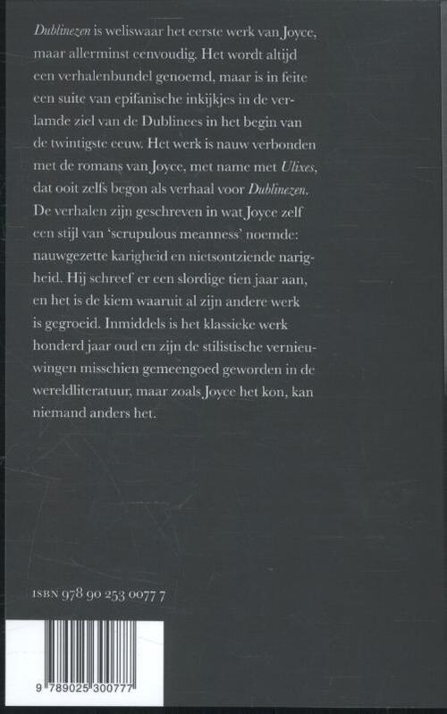 Dublinezen is weliswaar het eerste werk van Joyce, maar allerminst eenvoudig. Het wordt altijd een verhalenbundel genoemd, maar is in feite een suite van epifanische inkijkjes in de verlamde ziel van de Dublinees in het begin van de twintigste eeuw. Het werk is nauw verbonden met de romans van Joyce, met name met Ulixes, dat ooit zelfs begon als verhaal voor Dublinezen. De verhalen zijn geschreven in wat Joyce zelf een stijl van ‘scrupulous meanness’ noemde: nauwgezette karigheid en nietsontziende narigheid. Hij schreef er een slordige tien jaar aan, en het is de kiem waaruit al zijn andere werk is gegroeid. Inmiddels is het klassieke werk honderd jaar oud en zijn de stilistische vernieuwingen misschien gemeengoed geworden in de wereldliteratuur, maar zoals Joyce het kon, kan niemand anders het.