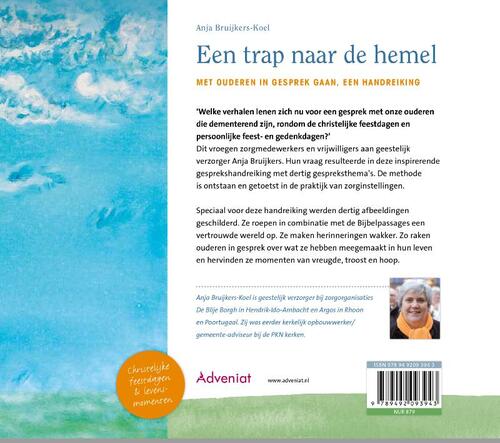 ‘Welke verhalen lenen zich nu voor een gesprek met onze ouderen die dementerend zijn, rondom de christelijke feestdagen en persoonlijke feest- en gedenkdagen?’ Dit vroegen zorgmedewerkers en vrijwilligers aan geestelijk verzorger Anja Bruijkers. Hun vraag resulteerde in deze inspirerende gesprekshandreiking met dertig gespreksthema’s. De methode is ontstaan en getoetst in de praktijk van zorginstellingen. Speciaal voor deze handreiking werden dertig afbeeldingen geschilderd. Ze roepen in combinatie met de Bijbelpassages een vertrouwde wereld op. Ze maken herinneringen wakker. Zo raken ouderen in gesprek over wat ze hebben meegemaakt in hun leven en hervinden ze momenten van vreugde, troost en hoop. Anja Bruijkers-Koel is geestelijk verzorger bij zorgorganisaties De Blije Borgh in Hendrik-Ido-Ambacht en Argos in Rhoon en Poortugaal. Zij was eerder kerkelijk opbouwwerker/ gemeente-adviseur bij de PKN kerken.