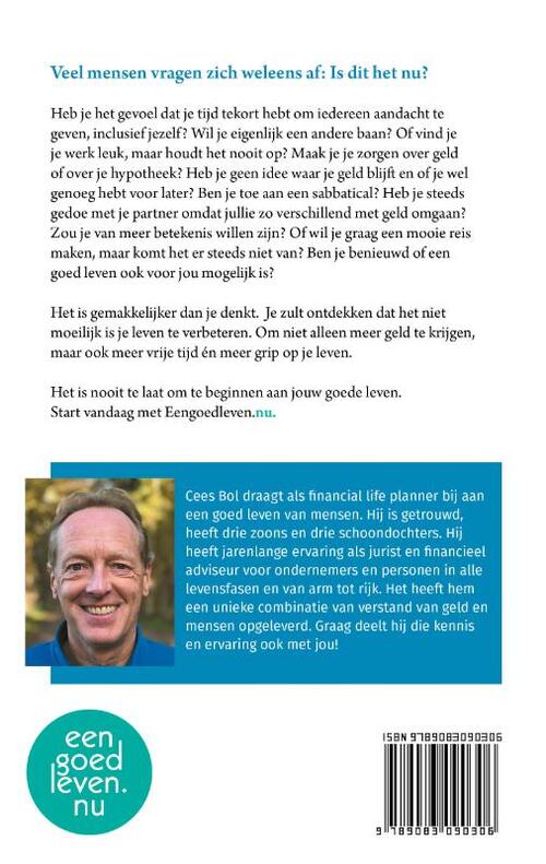 Veel mensen vragen zich weleens af: Is dit het nu? Heb je het gevoel dat je tijd tekort hebt om iedereen aandacht te geven, inclusief jezelf? Wil je eigenlijk een andere baan? Of vind je je werk leuk, maar houdt het nooit op? Maak je je zorgen over geld of over je hypotheek? Heb je geen idee waar je geld blijft en of je wel genoeg hebt voor later? Ben je toe aan een sabbatical? Heb je steeds gedoe met je partner omdat jullie zo verschillend met geld omgaan? Zou je van meer betekenis willen zijn? Of wil je graag een mooie reis maken, maar komt het er steeds niet van? Ben je benieuwd of een goed leven ook voor jou mogelijk is? Het is gemakkelijker dan je denkt. Je zult ontdekken dat het niet moeilijk is je leven te verbeteren. Om niet alleen meer geld te krijgen, maar ook meer vrije tijd én meer grip op je leven. Het is nooit te laat om te beginnen aan jouw goede leven. Start vandaag met Eengoedleven.nu. Cees Bol draagt als financial life planner bij aan een goed leven van mensen. Hij is getrouwd, heeft drie zoons en drie schoondochters. Hij heeft jarenlange ervaring als jurist en financieel adviseur voor ondernemers en personen in alle levensfasen en van arm tot rijk. Het heeft hem een unieke combinatie van verstand van geld en mensen opgeleverd. Graag deelt hij die kennis en ervaring ook met jou!