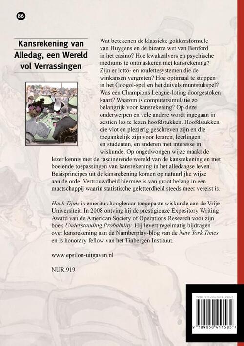 Wat betekenen de klassieke gokkersformule van Huygens en de bizarre wet van Benford in het casino? Hoe kwakzalvers en psychische mediums te ontmaskeren met kansrekening? Zijn er lotto- en roulettesystemen die de winkansen vergroten? Hoe optimaal te stoppen in het Googol-spel en het duivels muntstukspel? Was een Champions League-loting doorgestoken kaart? Waarom is computersimulatie zo belangrijk voor kansrekening? Op deze onderwerpen en vele andere wordt ingegaan in zestien los te lezen hoofdstukken. Op ongedwongen wijze maakt de lezer kennis met de fascinerende wereld van de kansrekening en met boeiende toepassingen van kansrekening in het alledaagse leven. Basisprincipes uit de kansrekening komen op natuurlijke wijze aan de orde. Vertrouwdheid hiermee is van groot belang in een maatschappij waarin statistische geletterdheid steeds meer vereist is.