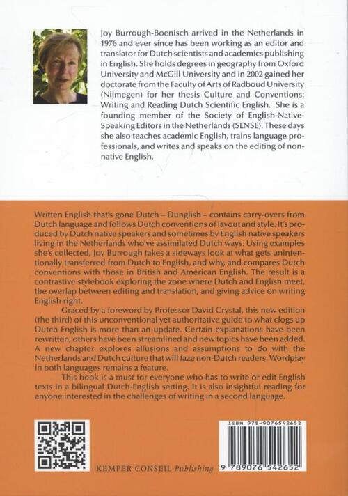 Written English that's gone Dutch - Dunglish - contains carry-overs from Dutch language and follows Dutch conventions of layout and style. It's produced by Dutch native speakers and sometimes by English native speakers living in the Netherlands who've assimilated Dutch ways. Using examples she's collected, Joy Burrough takes a sideways look at what gets unintentionally transferred from Dutch to English, and why, and compares Dutch conventions with those in British and American English. The result is a contrastive stylebook exploring the zone where Dutch and English meet, the overlap between editing and translation, and giving advice on writing English right.
