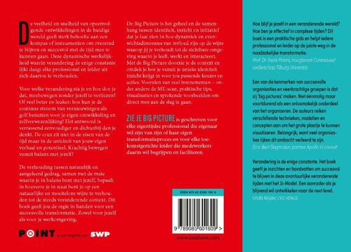 De veelheid en snelheid van opeenvolgende ontwikkelingen in de huidige wereld, geeft sterk behoefte aan een kompas of instrumenten om overeind te blijven en succesvol met de tijd mee te kunnen gaan. Deze dynamische werkelijkheid waarin verandering de enige constante lijkt daagt elke professional en leider uit zich daartoe te verhouden. Voor welke verandering sta je en hoe doe je dat; meebewegen zonder jezelf te verliezen? Of veel beter en leuker: hoe kun je de continue stroom van vernieuwingen als golf benutten voor je eigen ontwikkeling en zelfverwezenlijking! Het antwoord is verrassend eenvoudiger en dichterbij dan je denkt. De crux zit niet in de eisen van de tijd maar in de uniciteit van jouw eigen verhaal en potentieel. Krachtig bewegen vanuit balans met jezelf! De verhouding tussen natuurlijk en aangeleerd gedrag, samen met de mate waarin je in balans bent met jezelf is en met, bepaalt in hoeverre je in staat bent je op een natuurlijke en moeiteloze wijze te verhouden tot de steeds veranderende context. Dit boek geeft jou de regie in handen voor een succesvolle transformatie. Zowel voor jezelf als voor je werkomgeving. De BIG PICTURE is het geheel en de samenhang tussen identiteit, inzicht en initiatief dat je laat zien in hoe dynamiek en evenwichtsdimensies van invloed zijn op de wijze waarop jij je verhoudt tot de zichtbare omgeving waarin je leeft, werkt en interacteert. Met de BIG PICTURE doorzie je de context en ontdek je hoe je vanuit je unieke identiteit inzicht krijgt in voor jou passende keuzes en acties. Voorzien van veel instrumenten, praktische tips, visualisaties en sprekende voorbeelden om direct mee aan de slag te gaan. Dit boek is geschreven voor elke eigentijdse professional die eigenaar wil zijn van zijn of haar eigen transformatieproces en voor elke toekomstgerichte leider die medewerkers daarin wil begrijpen en faciliteren.