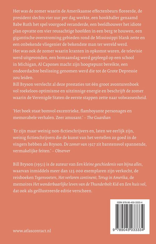 In De zomer van 1927 beschrijft Bill Bryson een zinderende zomer vol historische gebeurtenissen in de VS, van Babe Ruths heldendaden tot Lindberghs vlucht en Al Capones hoogtijdagen.