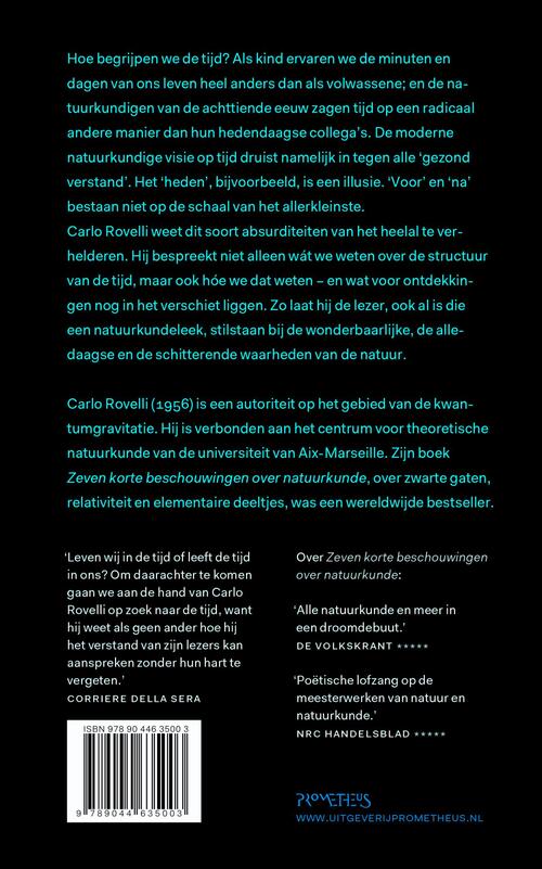 Hoe begrijpen we de tijd? Als kind ervaren we de minuten en dagen van ons leven heel anders dan als volwassene; en de natuurkundigen van de achttiende eeuw zagen tijd op een radicaal andere manier dan hun hedendaagse collega's. De moderne natuurkundige visie op tijd druist namelijk in tegen alle 'gezond verstand'. Het ʽhedenʼ, bijvoorbeeld, is een illusie. ʽVoorʼ en ʽnaʼ bestaan niet op de schaal van het allerkleinste. Carlo Rovelli weet dit soort absurditeiten van het heelal te verhelderen in enthousiast, eenvoudig proza. Hij bespreekt niet alleen wát we weten over de structuur van de tijd, maar ook hóe we dat weten - en wat voor ontdekkingen nog in het verschiet liggen. Zo laat hij de lezer, ook al is die een natuurkundeleek, stilstaan bij de wonderbaarlijke, de alledaagse en de schitterende waarheden van de natuur. Carlo Rovelli (1956) is een autoriteit op het gebied van de kwantumgravitatie. Hij is verbonden aan het centrum voor theoretische natuurkunde van de universiteit van Aix-Marseille. Zijn boek Zeven korte beschouwingen over natuurkunde, over zwarte gaten, relativiteit en elementaire deeltjes, was een wereldwijde bestseller. 'Nadat hij ons in zijn vorige boek door het heelal leidde, onderneemt Rovelli nu een reis die begint en eindigt bij onszelf, een ontdekkingstocht naar het allergrootste mysterie: wat is tijd?'LA REPUBBLICA 'Leven wij in de tijd of leeft de tijd in ons? Om daarachter te komen gaan we aan de hand van Carlo Rovelli op zoek naar de tijd, want hij weet als geen ander hoe hij het verstand van zijn lezers kan aanspreken zonder hun hart te vergeten.'CORRIERE DELLA SERA Over Zeven korte beschouwingen over natuurkunde: 'Alle natuurkunde en meer in een droomdebuut.'DE VOLKSKRANT ***** 'Poëtische lofzang op de meesterwerken van natuur en natuurkunde.'NRC HANDELSBLAD *****